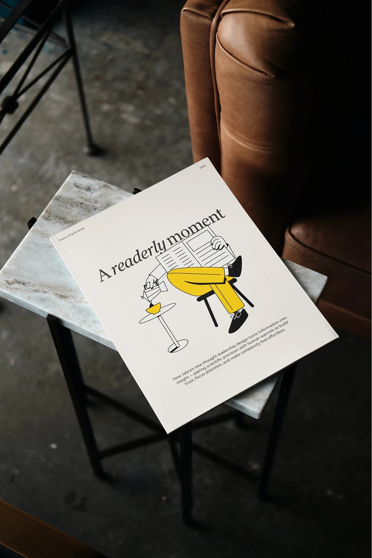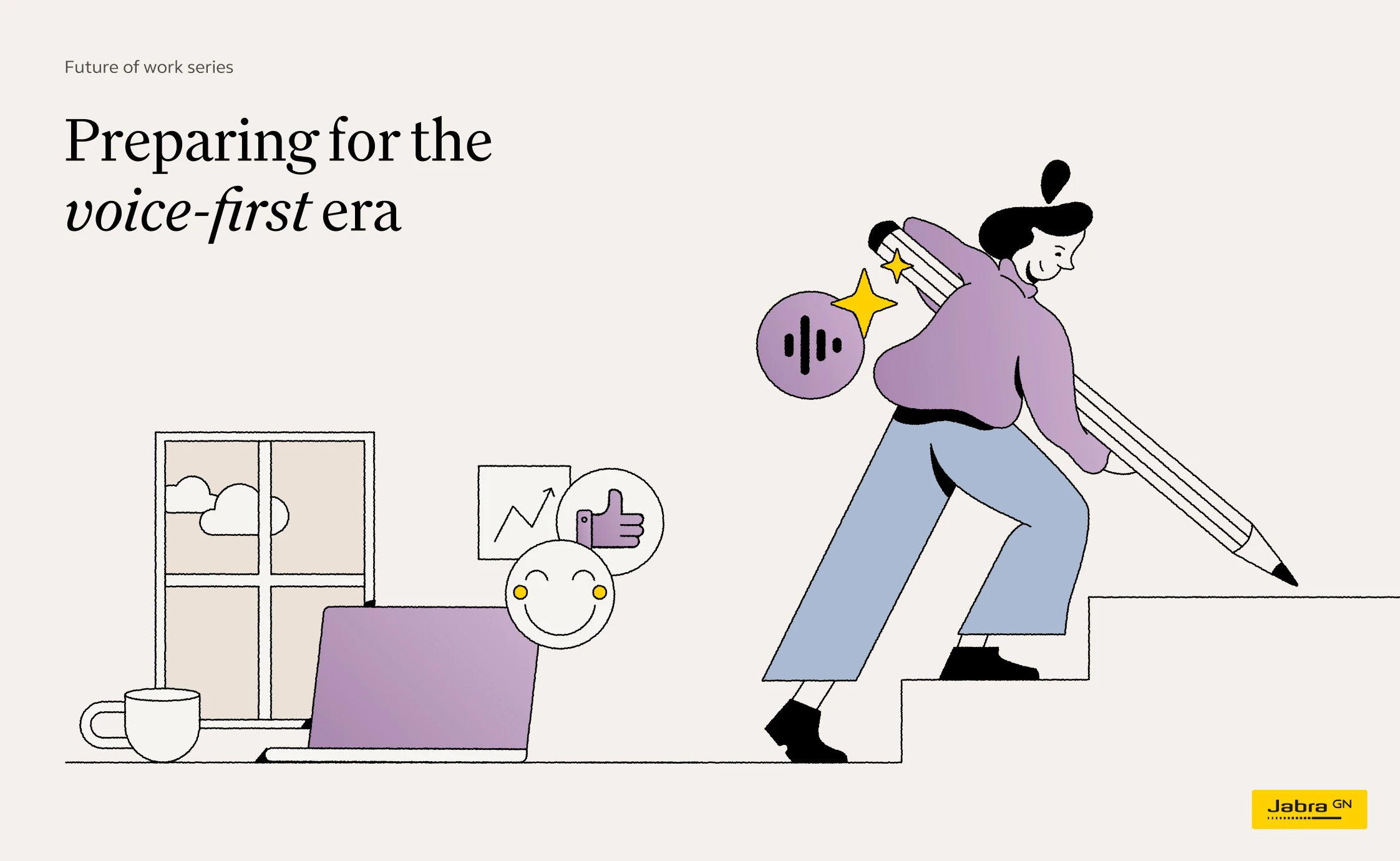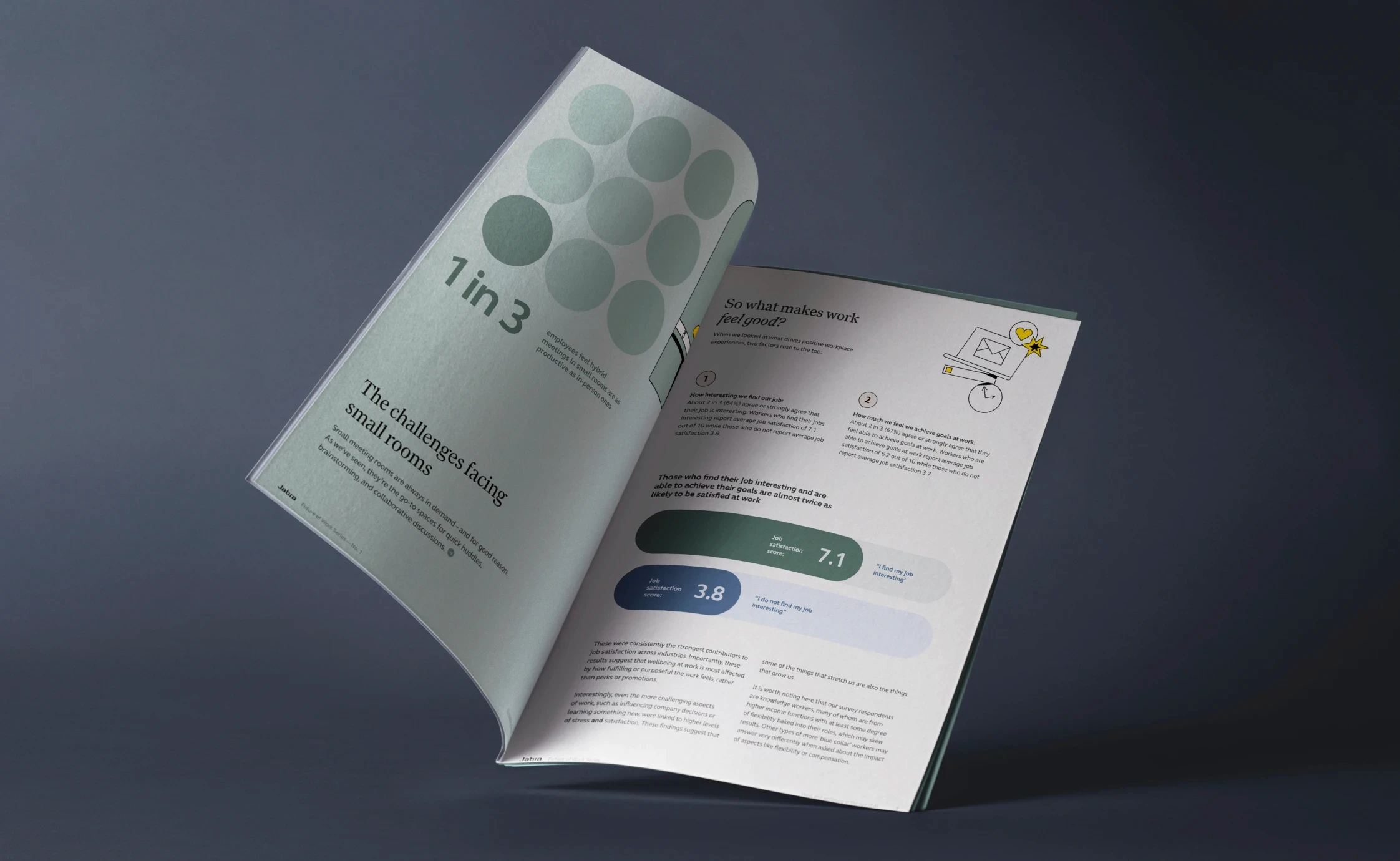 The design system is editorial at heart, minimalist, structured, and quietly authoritative. Sophisticated serif typography signals depth and authority, while expressive illustrations introduce character and accessibility. Data visualisation is crafted for clarity, always truthful and purposeful. A carefully restrained colour palette, complemented by Jabra Yellow and bright secondary tones, ensures continuity and impact.
