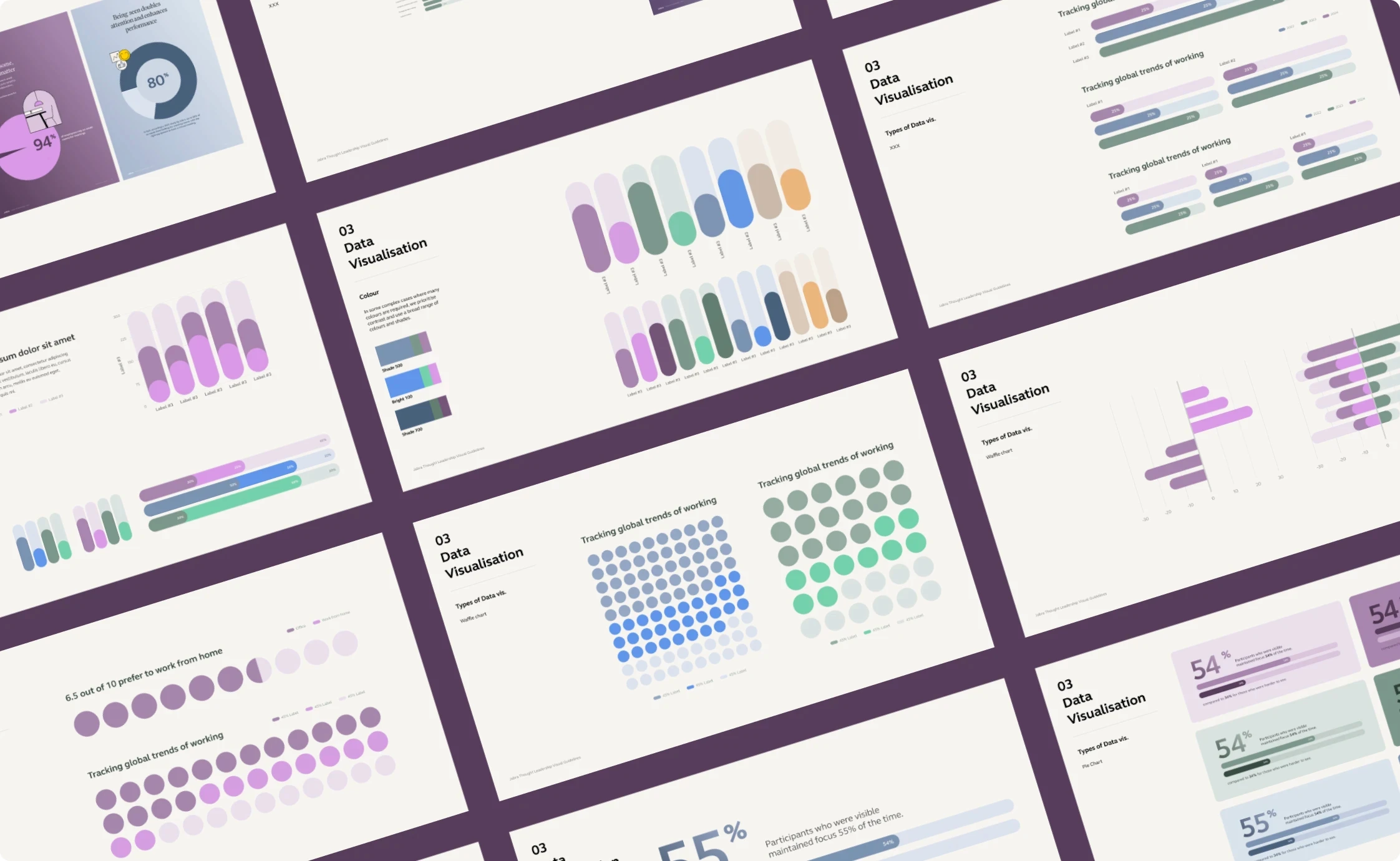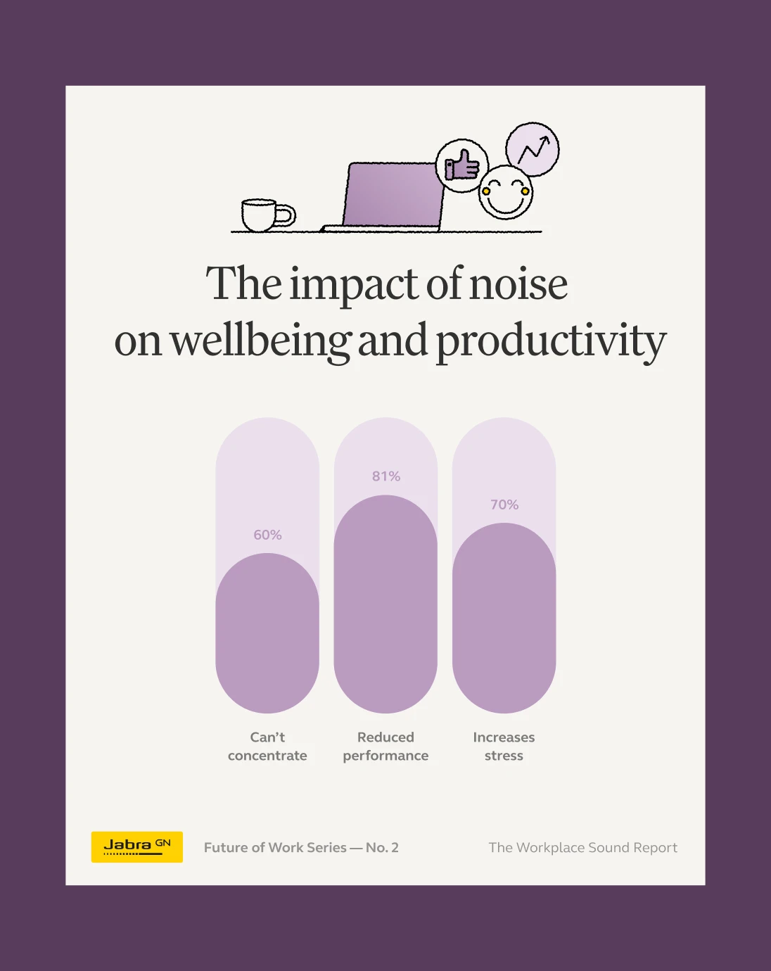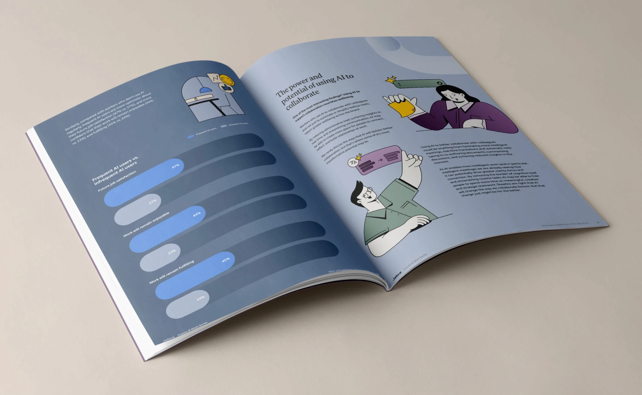 The design system is editorial at heart, minimalist, structured, and quietly authoritative. Sophisticated serif typography signals depth and authority, while expressive illustrations introduce character and accessibility. Data visualisation is crafted for clarity, always truthful and purposeful. A carefully restrained colour palette, complemented by Jabra Yellow and bright secondary tones, ensures continuity and impact.